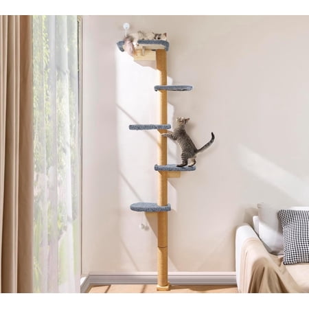 Peluomoz Adjustable Height Floor-to-Ceiling Kitten Cat Tree – Wall-Mounted 83” Climbing Tower with Grey Plush Pads & Scratching Post