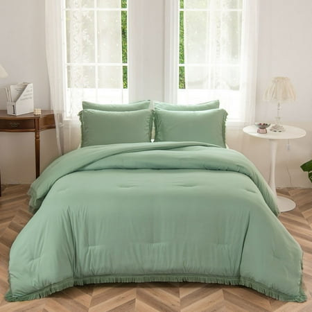 LEAFAX Sage Green Comforter Set King Boho Bedding Set Exquisite Tassel Pattern Microfiber Filling, Cozy Lightweight All Season, 5-Piece