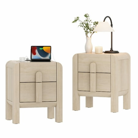 Modern Wood Nightstand Set of 2 with Drawers ,Curved Mid-Century End Table with Built-In Charging Station for Bedroom, Living Room,Entryway