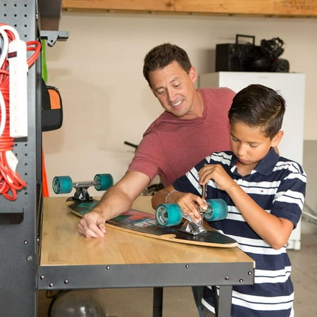 The Wall-Mounted Work Table from Lifetime Products is the perfect work and storage solution for your garage or shop area. This unique folding table is constructed of water-resistant wood with a heavy-duty metal frame. The sturdy steel frame has a powder-coated finish that protects against weather, rust, and corrosion and the wood table surface is made of water-resistant durable wood. Included in the design are interior and exterior pegboards to add hooks for tool storage, and the exterior loop will fit any standard padlock, keeping your tools safe and secure. Included are 30 organization hooks to keep your equipment and space in order. The table also has a convenient fold-up design to make storage simple.