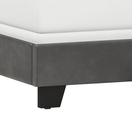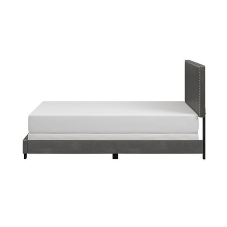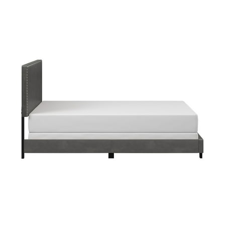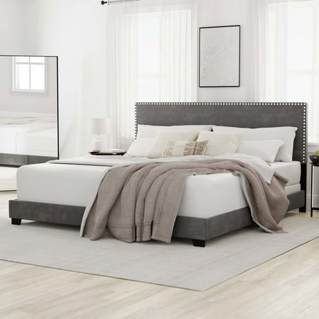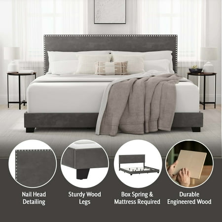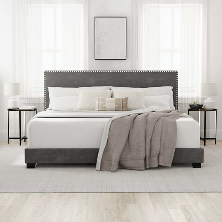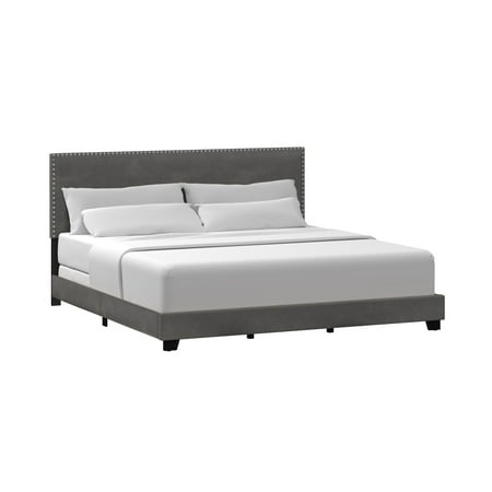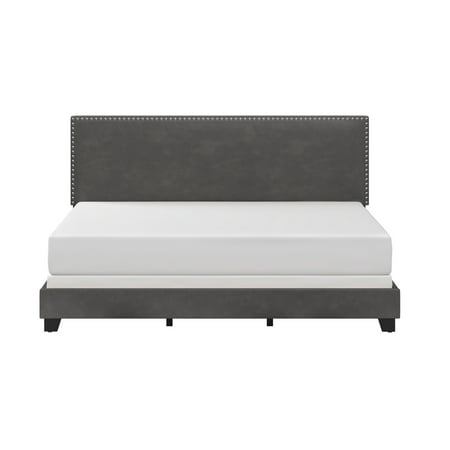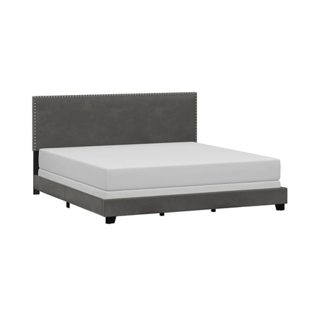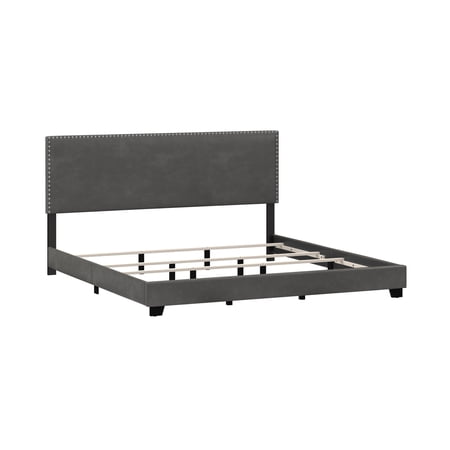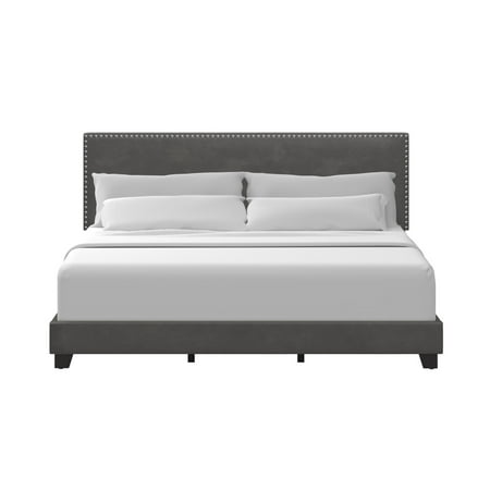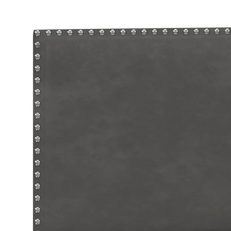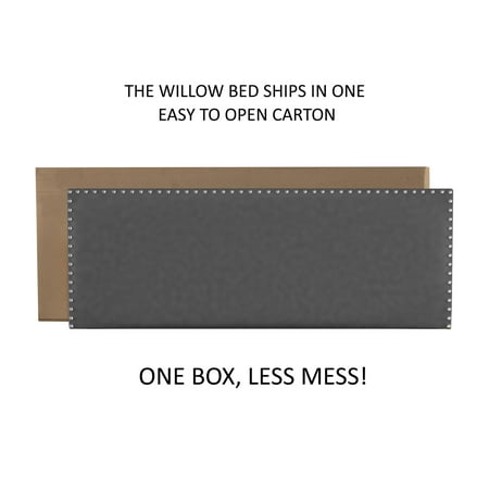 Drift off to dreamland in style with the fully upholstered Willow King Bed, a pick that pairs a traditional silhouette with bold silver hued nail head trim. Paired with a charcoal gray faux leather, and espresso finished feet, this bed is dramatic, yet simple, and blends well in most décor, while providing fresh flair into your master, guest, or youth décor. Crafted with a solid wood frame, this bed requires both a box spring and mattress to complete the look. Assembly required.