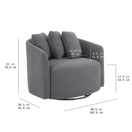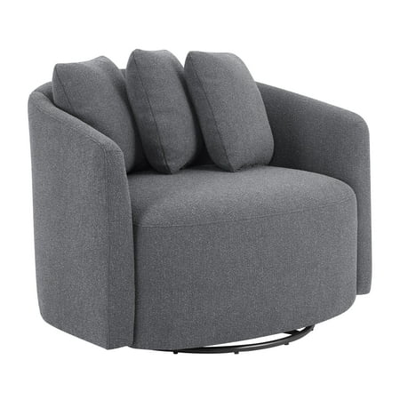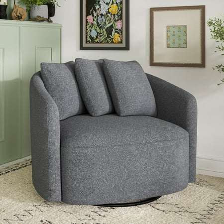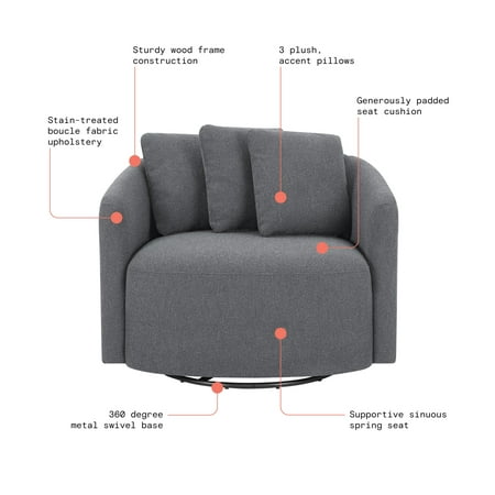 We love the Drew Chair by Beautiful for its wonderful blend of style and comfort. The streamlined design of this oversized boucle swivel accent chair is highlighted by soft, fabric upholstery with natural fibers for an elegant touch and soothing gray tones that compliment a variety of home decor styles and color palettes. The 3 plush accent pillows add customizable comfort. The metal swivel base spins 360 degrees so you can easily direct your attention anywhere in the room. Relax and talk with friends or curl up with a good book, the Drew Chair by Beautiful will be the perfect addition to your living room, reading nook or favorite space.