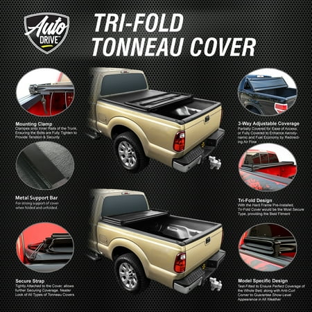 Walmart's Auto Drive soft tri folding truck bed tonneau covers offer great protection for your gear at an everyday low price. All covers have been tested for fitment and proven durable in all weather conditions, backed by Walmart's 90 day return policy. Tri-fold truck bed tonneau covers have all the convenience of soft covers with the structure and security of a hard cover. Each truck bed cover uses UV-resistant vinyl & heavy-duty latching to provide a sleek and tight appearance. All Auto Drive tonneau covers fit specific to your vehicle's year, make, model, and bed length.