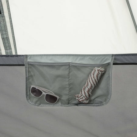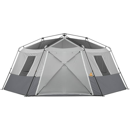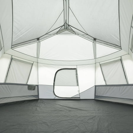 This Ozark Trail 11-Person Instant Hexagon Cabin Tent is the perfect tent to take with you on your next outdoor adventure. The innovative instant steel frame allows this tent to be set up in under two minutes for a fun and easy camping experience. This 255 square foot, 11-person instant tent requires no assembly because the poles are pre-attached to the tent, just unfold and extend. Enjoy the panoramic views with the extra-large windows, front and rear doors, and a shade porch. It will comfortably fit two queen air beds or up to 11 campers in sleeping bags on the floor. Keep yourself organized and connected with the included two storage pockets, gear loft and electrical cord access. Included are sixteen steel tent stakes to secure the tent and a tent carry bag for easy portability and storage. Make camping easy and enjoyable with the Ozark Trail 11-Person Instant Hexagon Cabin Tent. Take this tent with you on your next outdoor adventure.