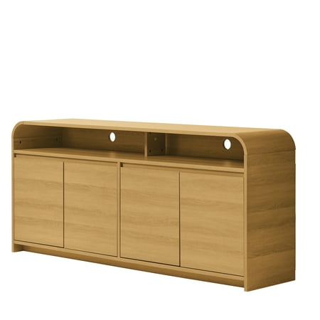 The Better Homes & Gardens Juliet Curved TV Stand for TVs up to 75" is the perfect addition to your entertainment collection. The modern beauty of this TV stand comes with elegant, arched design. With ample storage space for your media components, this TV stand is both functional and stylish. Including adjustable shelving, this storage cabinet makes it simple to organize your essentials where you want them. Keep books, collectibles, decor, and more on the open, adjustable shelving. Cord management is available in the back to keep your electronics and media cables organized.With 2 adjustable shelves inside for storing all your media equipment, decorative pieces. The sophisticated look comes in 2 colors, Walnut and light honey, and will blend seamlessly into your other furniture and decor.