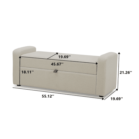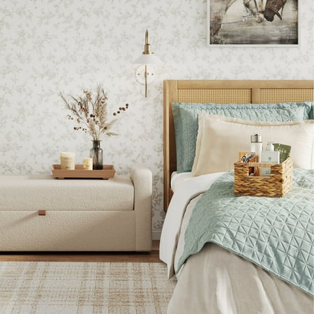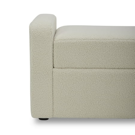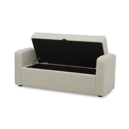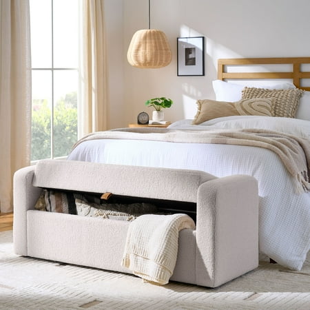 The Better Homes and Gardens Springwood Storage Bench is the perfect addition to any bedroom, providing a stylish seating option and functional storage space. This bench features a classic boucle fabric upholstery that adds a touch of elegance and sophistication to any decor. It was designed with comfort in mind, thanks to its Dacron and high-density foam padding. Whether you use it to sit and put on your shoes or to relax and read a book, you can be sure that this bench will provide the utmost comfort. One of the standout features of this bench is its storage capability. The seat opens to reveal a spacious compartment where you can store blankets, pillows, or any other items you want to keep out of sight. This provides a convenient solution for decluttering your space while keeping your belongings within easy reach. It is constructed with solid and engineered wood ensuring durability and stability, allowing you to enjoy this piece for years. Another advantage of this 55 in wide bench is its easy assembly. The legs can be conveniently attached to the base, allowing you to set up the bench in no time. Whether used as a seating option, storage solution, or a decorative element, this bench will surely enhance your room's overall appeal.