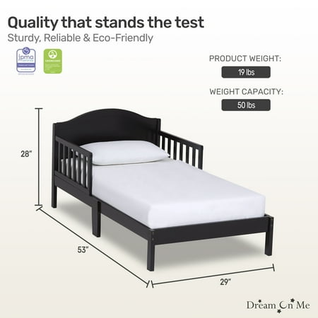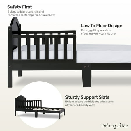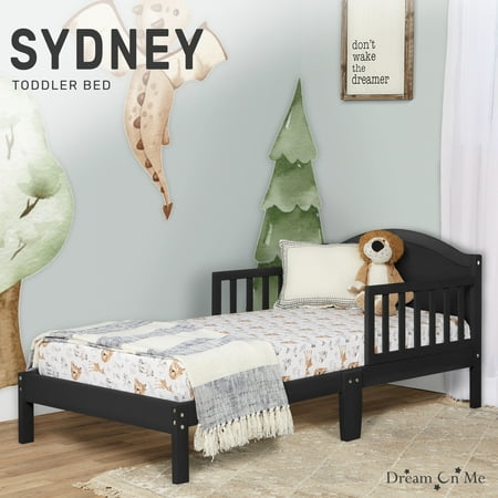 Does this toddler bed offer a classic silhouette with its bell-shaped full panel headboard design that will blend nicely into any child's room and transition with them as they grow with a low to the floor design, it is ideal for your toddler to safely get in and out of bed. It is reinforced for stability with center legs and comes complete with two side safety rails for added security in radiant finishes. The Dream On Me Sydney Toddler Bed is the perfect transition for toddlers, who have outgrown their cribs but are still too small for an adult bed. The brilliant combination of playful colors and outstanding comfort make this bed a perfect way to enhance any child's bedroom.