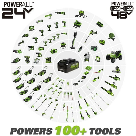 The Greenworks 24V Powerballâ„¢ lithium-ion platform powers 125+ indoor & outdoor products, including lawn mowers, blowers, string trimmers, chainsaws, power tools and more! Our 24V lithium-ion battery provides 20% more power and 35% more run-time, and delivers fade-free power with no memory loss after charging. The outdoor power equipment is ideal for tackling yards up to 1/3 acre. The Greenworks 24V Powerballâ„¢ platform comes with a 3 Year Limited Tool & Battery Warranty to protect your investment.