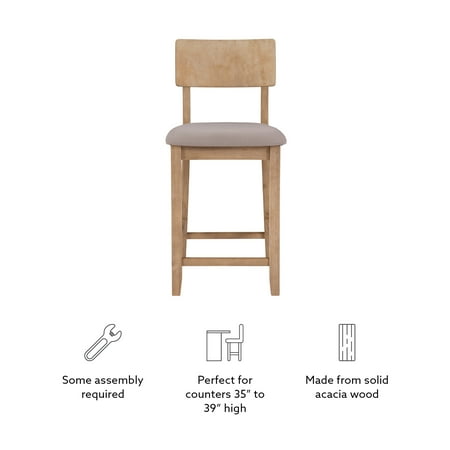 Bring timeless charm and modern comfort to your kitchen or dining space with the Linon Jordan Wood Counter Stool. Designed for both style and support, this stool features a solid acacia wood frame, expertly wire-brushed and finished with a hand-applied grey wash glaze to enhance the natural grain. The grey linen and cotton-upholstered seat is generously padded, offering plush comfort for long conversations and casual dining. A slightly curved backrest and built-in footrest provide ergonomic support, making this stool a cozy yet stylish addition to any counter-height setting. With a seat height of 25.5 inches, this counter stool is the ideal match for kitchen islands and counters ranging from 35 to 39 inches high. Whether used alone or paired with the matching tavern table, it blends seamlessly into modern, rustic, or farmhouse décor. Built to last, the durable acacia wood construction supports up to 225 lbs., ensuring stability for everyday use. Simple assembly means you’ll be enjoying your new favorite seat in no time.