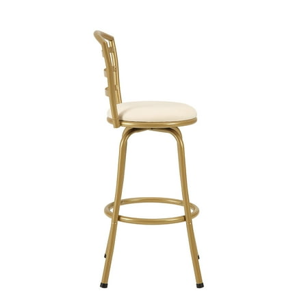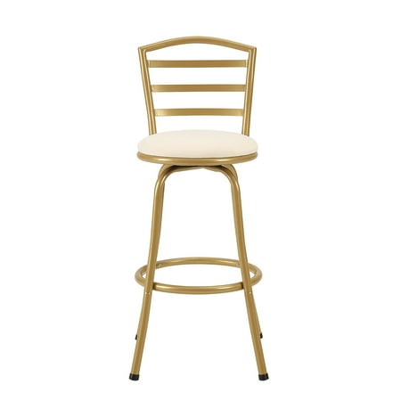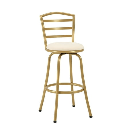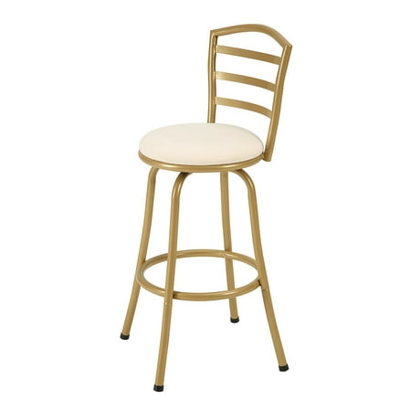 The Mainstays 3-Pack Indoor 24" or 29" Swivel Adjustable Gold Metal Barstool with Microfiber Cream Seat seats will give your home a modern look while offering extra seating for your visitors. It's constructed with a sturdy metal frame that provides reliable support, so you can relax and hang out in comfort. The metal barstool is made with a stylish ladder back design, which creates a contemporary look that will easily complement your rooms decor. The set also features a 360-degree swivel action, enabling you and your guests to turn in any direction effortlessly. With multiple color schemes you can find the perfect style for your home. The stool comes with interchangeable legs that allow for 24" or 29" seat heights, to meet your needs. This item is ideal for use at a breakfast bar, kitchen island, home bar or counter-height table, It comes with tools and all the necessary hardware for quick and easy assembly.
