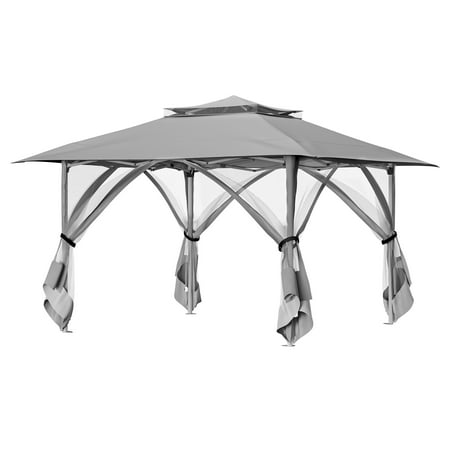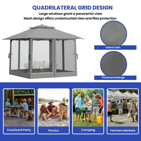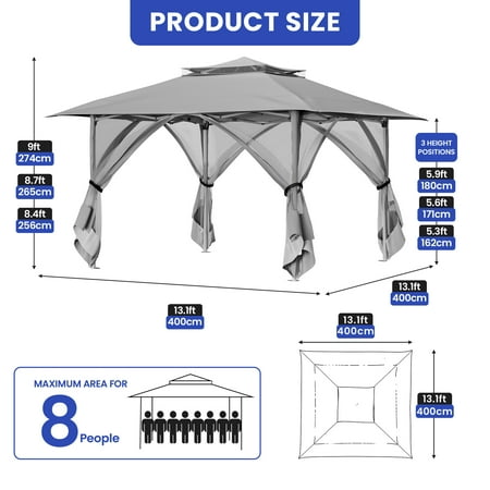 Product Description: Elevate your outdoor living with this 13'x13' pop-up gazebo. Featuring a double-vented roof canopy and netting walls, it provides ample shade and ventilation. The durable, double-roof design offers weather protection, while the beige color scheme complements any backyard, patio, or garden setting. This versatile gazebo tent is easy to set up for instant shade and comfort. High Light: -High Quality Material -Easy To Install -Double Roof -Adjustable Height Specifications: Size: 13x13 FT Color: Beige Material: Metal , Polyester Product Dimensions: 156"L x 156"W x 108"H Item Weight: 47.4 pounds Occupancy: 7-8 People