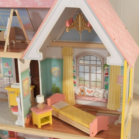 Standing over four feet tall and featuring four levels of play, the KidKraft Lola Mansion Dollhouse is spacious enough to house big dreams and big play! This dollhouse is for 12" toy dolls and includes six rooms, an expansive carport, 30 pieces of doll furniture and other doll accessories, a working elevator, a staircase, an attic, an easel with a sticky notepad for writing or drawing on, and more. Some dollhouse pieces even have light and sound features (batteries are included). Each room of this KidKraft Wooden Dollhouse is full of bright colors and lifelike graphics for hours of storytelling and role-playing for your child! Suitable for 4 years and older.