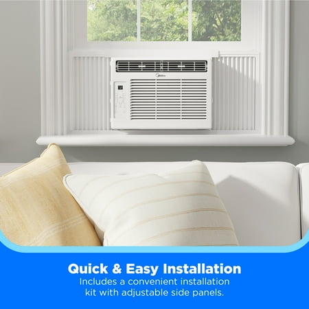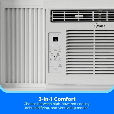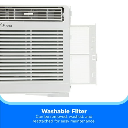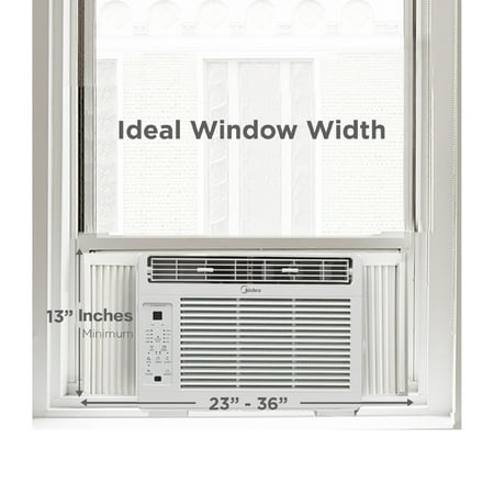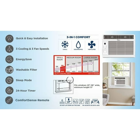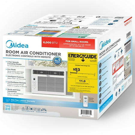 Stay comfortable all summer long with the new Midea 6,000 BTU Window AC with Comfort Sense Control. Midea’s new ComfortSense remote automatically adjusts the cooling strength based on the location of the remote! With three different cooling settings and three different fan speeds - there is no doubt you will find the setting that provides you with optimal comfort. You can select high, medium, or low - or use the energy saver button, designed to help you lower your energy bill. With the 24-hour timer you could set the timer, so your ac turns on an hour before you get home! The Midea 6,000 BTU Window AC with Comfort Sense device is ideal for cooling smaller spaces up to 250 square feet. The Midea 6,000 BTU Window AC with Comfort Sense also comes with a clean filter indicator button that lights up when it is time to remove and clean it. The Midea 6,000 BTU Window AC with Comfort Sense is designed to fit windows 23"-26" wide, with and a minimum height of 13".