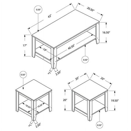 Whether you need the perfect living room table set to match your current decor style or if you're starting fresh, this is the perfect coffee table and end table trio for you. In a beautiful trendy grey wood-look finish, these living room tables offer top and bottom shelves for ample storage space so that you can sport any decorations or electronics. Made of a sturdy, thick panel construction, these tables can be placed just about anywhere in your living room, family room or basement. They are also perfect for small homes, condos or apartments. Features: Ideal match for your sofa with a versatile grey wood-look finish Characterizing contemporary styling accurately with a wood look texture, this living room table set includes one coffee table and two end tables Each table in this 3 piece coffee table set boasts ample surface space for decorations, electronics, books or more; perfect for the living room, family room, basement or den Each table has a bottom shelf for even more storage options Product dimensions (Coffee table): 42 Inch L x 20.5 Inch D x 17 Inch H ; End Tables: 20 Inch W x 20 Inch D x 20 Inch H