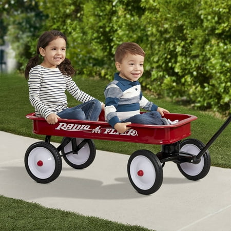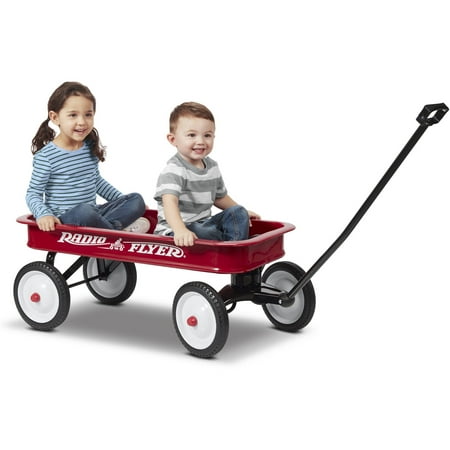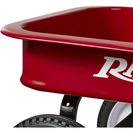 This classic red full-sized Radio Flyer wagon has become a symbol of American childhood. The all-steel seamless body with no-scratch edges and 10” steel wheels with real rubber tires ensure this wagon is built to last for generations of family fun! The wagon also features an extra-long handle that folds under for storage and a controlled turning radius to prevent tipping.