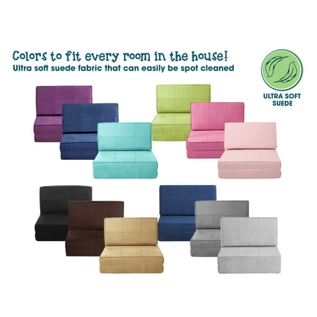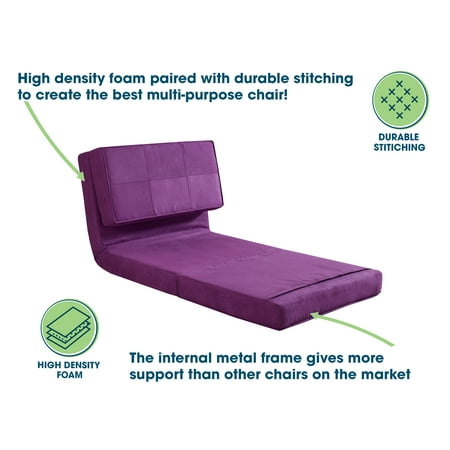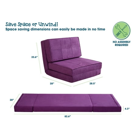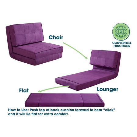 Whether your kids are studying, hanging out with friends or lounging around, this Your Zone 3 Position Convertible flip chair is the perfect addition to any room. With three convertible positions, it is perfect for small spaces, sleepovers and hang outs. It can unfold into a bed with one part remaining folded to serve as a pillow for guests. It can completely fold up into a comfortable chair and can serve as a reclining lounge chair. Push top of back cushion forward to hear "click" and it will lie flat for extra comfort. These space-saving conversions can easily be made in no time. It is composed of a plush ultra-suede material for added comfort. The material is spot clean only. The trendy and multi-functional chair will add to the ambiance of any room in the house. It is available in a variety of colors and patterns. There is no assembly required.