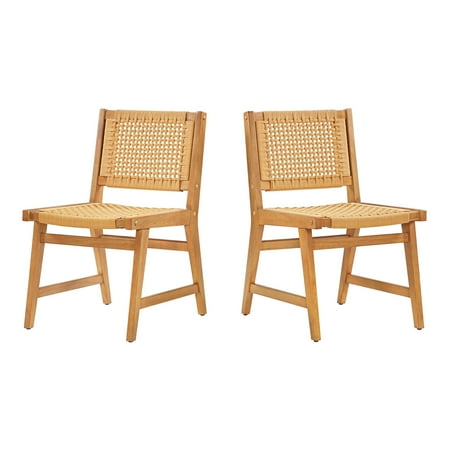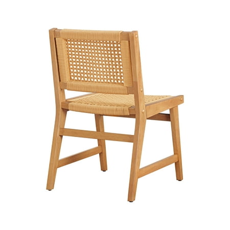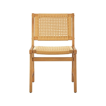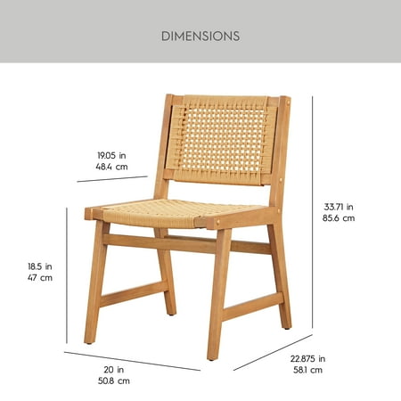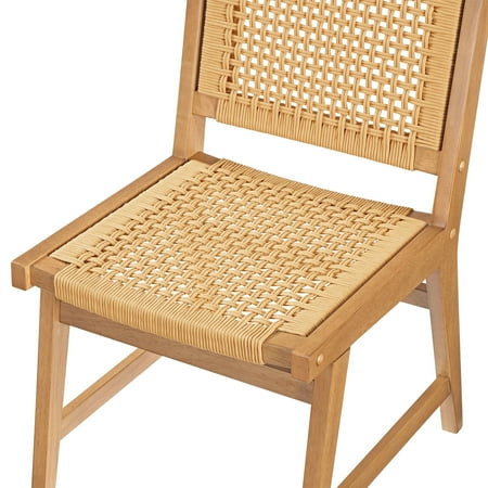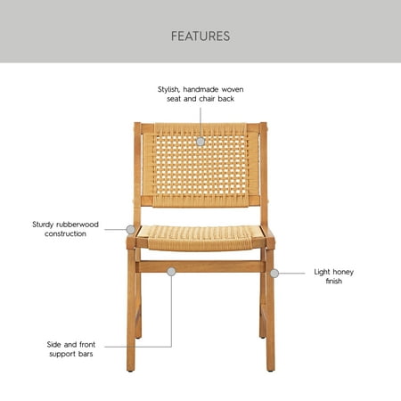 Upgrade your dining experience with the Better Homes & Gardens Vista Woven Coastal Dining Chairs. This set of two dining room chairs features a durable rubberwood construction with a warm light honey finish, perfect for adding style and practicality to your home. The handwoven seat and back create a unique and natural aesthetic, adding a touch of coastal charm to your space. Designed with a mid-century flair, these chairs effortlessly complement various decor styles, whether in dining rooms, kitchens, or cozy breakfast nooks. Each woven dining chair includes side support bars for enhanced stability during everyday use, ensuring lasting quality and comfort. Coordinate them with matching dining room furniture for a cohesive look.