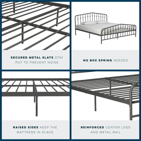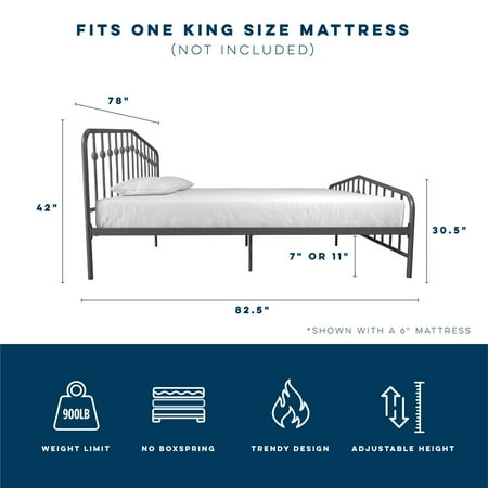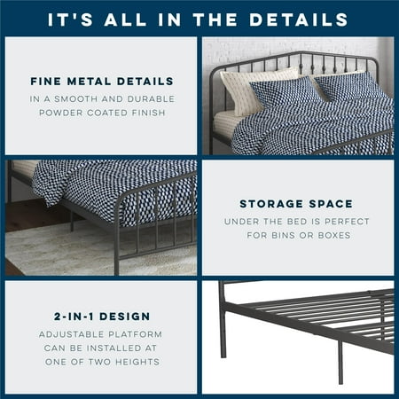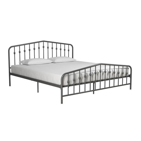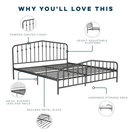 Get inspired to introduce fresh ideas into your bedroom to create a look that is both cozy and elegant. The Novogratz Bushwick Metal Bed has a simple design that will perfectly complement rooms of any style and decor. With round finials featured on the headboard and footboard posts, its style and color can be easily combined with bold colors and accessories to brighten up the room. Complete with metal slats, side rails and center legs, this bed's sturdy construction provides full support and comfort to the body and mattress. The metal slats remove the need for any additional box spring or foundation, while also providing your mattress with much needed support and breathability. For your convenience, the Novogratz Bushwick Metal Bed has two base heights - 6" or 11" clearance, to give you the option to use the under bed space as extra storage space for seasonal clothing and accessories. Available in multiple sizes and colors, there is the perfect Bushwick for every home.