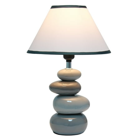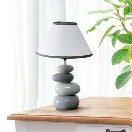 Stones of ceramic in light and dark gray variations stack vertically to create a lovely sturdy base beneath the empire fabric shade in white with dark gray trim. This unique table lamp is the perfect fit to add a little neutral colored décor to your space whether in your home or office.