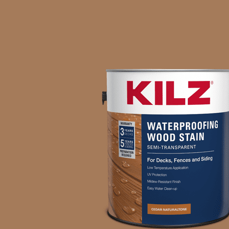 This KILZ Semi-Transparent Wood Stain features a 100 percent acrylic formula, which can last for up to three years on decks or five years on fences and siding due to its durability. Its innovative mix of ingredients will easily add beauty while allowing the natural wood grain to show through. This exterior wood stain provides a durable, water-repellent finish that also protects against the sun's harmful UV rays, offering a performance that users can rely on. Clean-up is easy with soap and water, so more time can be spent relaxing on the deck. The cedar wood stain is easy to apply for added convenience. It's available in a variety of shades, allowing for an optimal look for the home. The can has a helpful carrying handle so it can be moved around easily. This KILZ Semi-Transparent Wood Stain will make a lovely enhancement to a favorite space with its reliable blend.