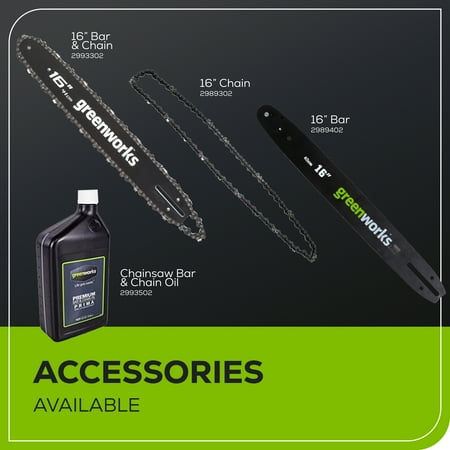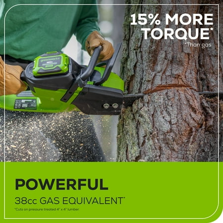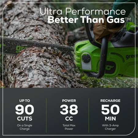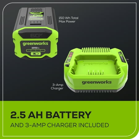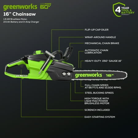 Work smarter and enjoy constant, fade-free power with the Greenworks 60V, 2kW battery-powered 16 in. Cordless Lithium-Ion Brushless Chainsaw, 38cc Gas Chainsaw Equivalent, CS60L2510, with up to 90 cuts on a single charge, this lightweight, quiet-running saw features chain speeds up to 66 ft/s for fast cuts with no bogging down, heat-treated steel bucking spikes for gripping wood securely, mechanical-activated chain brake for kick-back protection, and automatic chain oiler that keeps chain perfectly lubricated. With hassle-free, trigger starts, you'll get to work fast, with no priming, choke, no pull cord; plus, battery fully recharges in just 50 minutes. Greenworks exclusive Intelligent Power combines Brushless motor technology, lithium-ion battery power, superior cutting, and ultra-fast control systems for power output equivalent to a 38cc gas-powered motor. I includes 2.5 Ah lithium-ion battery and charger. Battery is compatible with 75+ Greenworks Pro 60V products.