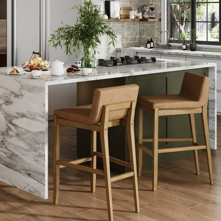 Rustic, simple, and functional - that's Gracie! A modern bar stool that features a solid wood frame and C-shaped cushion, this wooden bar stool is the perfect seat on your kitchen island for entertaining your guests over a glass of wine. Its wide seat and thick cushion provides comfort, together with its built-in foot rest and classy exposed wood backing. Gracie is dainty yet sturdy, and the best part is it only takes 20 minutes to put together. Nathan James is the furniture company built for this generation. You don't need to spend a fortune to get quality design-first furniture, and when we say easy assembly, we mean it. Our guarantee is our word. Your purchase is backed by a 100% money-back guarantee. If you have any quality issues, contact us, and we will send you a replacement immediately—no questions asked. This product is not recommended for commercial use. Materials: - Rubberwood frame - Light brown faux leather upholstery fabric - Foam seat Assembly Must-Haves: - Packaging carton as working surface - Philips head screwdriver Weight Limit: - 300 lbs