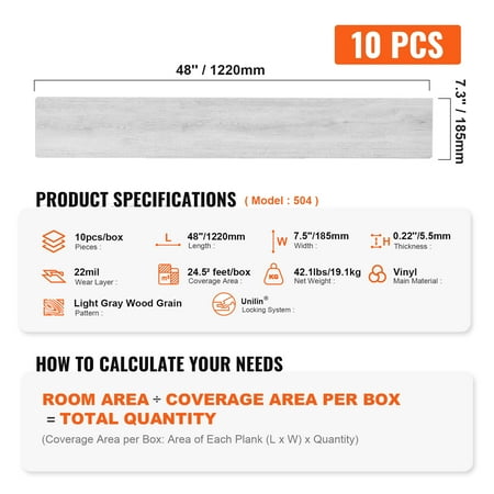 Product Description KFFKFF Vinyl Underlay: Enhancing Your Home Décor Revitalize your living space with the KFFKFF vinyl flooring. This versatile and hassle-free option effortlessly adds a touch of vibrancy to any room. Crafted with utmost durability, it withstands everyday wear and tear, promising a long-lasting performance. The waterproof surface ensures easy cleaning, making it an ideal choice for both home decoration and office renovation projects. Stylish Vinyl Floor Tiles Transform any space with ease - the perfect choice for home decor! Built to Last Uncompromising durability meets timeless style, ensuring a floor that will stand the test of time. Effortless Maintenance Say goodbye to tedious cleaning - the waterproof surface makes it a breeze to keep your floors looking pristine. Simple Installation Revolutionary click-lock assembly system makes installation a breeze, even for beginners. Versatile and Practical Ideal for homes, offices, and commercial spaces, this waterproof floor tile is a versatile solution for any setting. Endless Design Possibilities Discover a world of options with a wide range of textures, colors, and shapes to create stunning home decor combinations. Specifications Model: 504 Pieces: 10pcs/box Length: 48''/1220mm Width: 7.3''/185mm Height: 0.22''/5.5mm Wear Layer Thickness: 0.56mm/22mil Soundproof Mat Thickness: 0.06/1.5mm Coverage Area: 24.5²feet/box Pattern: Light Gray Wood Grain Net Weight: 42.1lbs/19.1kg Main Material: Vinyl Package Content Vinyl Floor Tile x 10 pcs