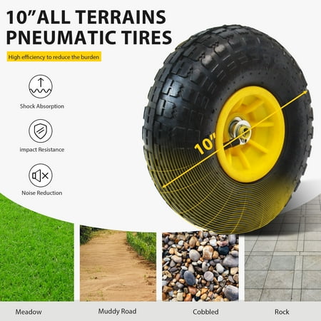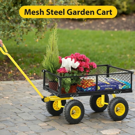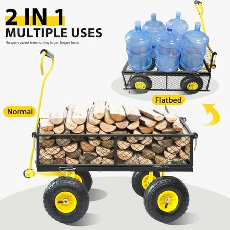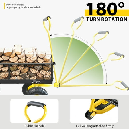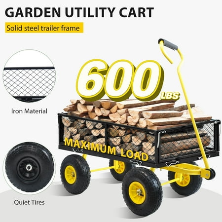 Wagon Garden trucks make it easier to transport firewood, plants, chicken feed, potted soil and honeycombs. The detachable side on the foldable utility wagon increases versatility when carrying larger loads. The practical garden trolley bears 550 pounds, so it is strong enough to carry heavy work. You don't have to drag heavy materials to the original place on multiple trips. Heavy reinforced steel frame, 180-degree steering range handle control and 10-inch pneum. -Removable on four sides, increasing versatility when carrying larger loads.-handle control over 180 degree rotation range. Durable steel frame can hold 550 pounds of goods-Wide wheelbase and 10-inch tires provide good stability and balance.