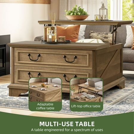 Keep your living room organized and stylish with this lift-top coffee table. Featuring a smooth, gas-strut lifting mechanism, it provides a large hidden storage compartment ideal for pillows, magazines, and more, along with 2 sliding drawers for additional organization. The farmhouse wood grain finish adds rustic charm, blending functionality with cozy aesthetics. Crafted from durable engineered wood, it promises long-lasting use while complementing various interior styles available in rustic white, gray, or dark oak.