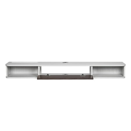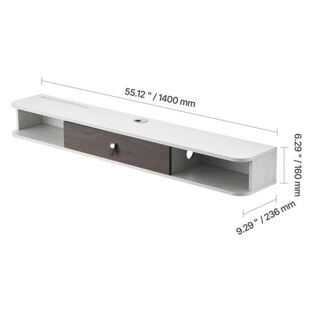 Product Description Enhance your living space with elegance, functionality, and intelligent convenience! The KFFKFF floating TV stand offers a stylish solution for optimizing space with its innovative built-in storage compartments. Keep your multiple devices neatly organized and shielded from dust, all while ensuring utmost privacy. This exceptional TV stand is not only durable, with a remarkable weight capacity of up to 115 lbs, but it is also water-resistant, wear-resistant, and incredibly easy to clean. Its silent design guarantees a peaceful viewing experience, and the hassle-free installation process makes it the perfect choice for upgrading the cleanliness of your living room. Innovative and Versatile Design Introducing the KFFKFF Smart Multi-Functional Design TV stand, a game-changer in storage solutions. With a dedicated router slot, this floating TV stand offers a unique and efficient way to meet all your storage needs. The semi-open drawers provide a sleek and organized space for your DVD player and other devices. Say goodbye to messy wires with the specially designed cable management holes, ensuring a clutter-free and tidy living space. Optimal Organization and Storage Experience the ultimate solution to cluttered devices with the KFFKFF TV stand. Designed to keep everything organized, this stand offers efficient storage for books, routers, game controllers, and more. Enjoy a clean and well-organized living space effortlessly, thanks to the smart and functional design of this TV stand. Enhanced Privacy and Dust Protection The KFFKFF TV stand not only provides ample storage but also protects your personal items and keeps dust at bay. With its privacy features, you can store your belongings securely and maintain a tidy and organized lifestyle. No more frequent cleaning of dust inside the cabinet, saving you time and effort. Create a beautiful and practical storage space with ease. Unmatched Stability and Durability Experience peace of mind with the KFFKFF floating TV shelf. Its reinforced design, featuring double screws and iron plate support, ensures stability and durability. This shelf has been weight-tested to support heavy items, making it the perfect choice for securely holding your TV and devices. Trust in its strength and reliability. Effortless Installation and Setup Transform your space in no time with the KFFKFF TV stand. It comes complete with all necessary accessories and a detailed installation guide, making the setup process a breeze. Simply mount it to the wall and follow the step-by-step instructions for quick and easy installation. Enjoy the convenience of a stylish and functional entertainment center without any hassle. Modern Sophistication for Your Home Elevate your home decor with the KFFKFF TV stand's versatile modern style. Its sleek and elegant white design adds a touch of sophistication to any living space, creating a bright and contemporary atmosphere. Experience the perfect blend of functionality and aesthetics with this stylish addition to your home. Specifications Item Model Number: SHSHDSG1116-2 Weight Capacity: 115 lbs / 52 kg Color: White, Wood Color Material: E1 Particleboard Product Dimensions: L x W x H: 55.12 in x 9.29 in x 6.29 in / 1400 mm x 236 mm x 160 mm Cable Hole Diameter: 2.05 in / 52 mm Product Weight: 9.9 kg / 21.8 lbs (including all accessories) Package Content 1 x Top Panel 1 x Bottom Panel 1 x Left Side Panel 1 x Right Side Panel 2 x Center Panel 2 x Top and Bottom Panels 2 x Back Panel 1 x Power Strip 1 x Cable Hole Hardware 9 Sets x Wall-Mounting Hardware (Expansion Screws + Expansion Tubes) 33 Sets (1 Extra Set) x 3-in-1 22 x Wood Dowels (2 Extra) 3 x 3.5×14 Self-Tapping Screws (1 Extra) 36 x Perfect Stickers (4 Extra) 1 x Screwdriver 1 x Instruction Manual