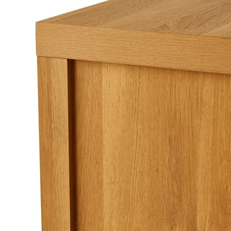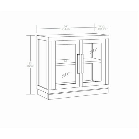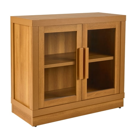 The Better Homes & Gardens Ezra Accent Cabinet presents a modern display cabinet that offers an effortless infusion of style into any room of the home. Create versatile storage and display options in the living room, dining room, entryway or kitchen with the modern geometric design of this utility wood accent cabinet. Behind its set of framed, safety-tempered glass doors with soft-close hinges, this fashion cabinet provides an adjustable, spacious shelf. Along with the bottom shelf, the display area is ideal for showcasing a prized collection of antiques, vintage China, or photos of family and friends. This living room storage cabinet has a strong and lightweight 2-inch panel construction and built-in adjustable base levelers so that it is durable yet versatile in any living space. Finished in the warm hues of Light Honey, with modern, geometric hardware, this Better Homes & Gardens Ezra Accent Cabinet with glass doors offers an updated version of a home storage classic.