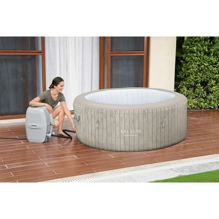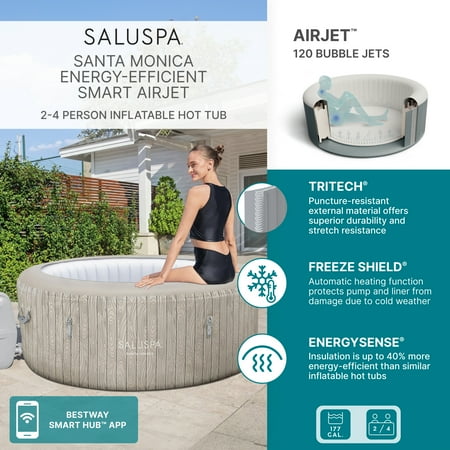 After a long day, there’s nothing more relaxing than sinking into warm, bubbling water right in your own backyard. The SaluSpa® Santa Monica Smart AirJet™ 4 provides a soothing massage experience for up to 4 people, while still being quick and easy to set up. This spa reaches up to 104ºF (40ºC) to provide ultimate relaxation as you are surrounded by 120 AirJet massage bubbles. Simply attach the pump and watch as it inflates. Increased Energy-Efficiency: The patent-pending EnergySense® insulation is constructed with a multi-layered material that is designed to prevent heat loss. This innovative construction makes this hot tub up to 40% more energy-efficient than similar inflatable hot tubs, keeping your hot tub temperatures high and your energy usage low. Control at Your Fingertips: This spa can be controlled from your smart device through the Bestway smartphone app. This innovation makes this hot tub one of the most convenient spas on the market. The app allows you to set your spa to the perfect temperature, activate the Power Saving Timer, run the water filter and control the massage system - all from the palm of your hand. Soothing Massage System: The AirJet system features 120 jets which release bubbles from the bottom of the spa to create a warm, bubbling hot tub environment. These soothing bubbles will help you relax and unwind right from the comfort of your home. Durable Construction: The external wall is constructed with 3-layer Tritech® material, proven to be both puncture and damage resistant. This material offers exceptional stretch resistance, allowing the spa to maintain its intended shape over time, no matter how many times you inflate and deflate it. Innovative Winterizing Technology: The included Freeze Shield® automatic heating function prevents inner components from freezing during colder temperatures. Designed with innovative winterizing technology, the system will keep the internal temperatures between 42º and 50ºF (6º and 10ºC) to prevent damage. Electrical Safety Information: Our spas feature a Ground Detection System that ensures the spa is used with an outlet having a proper ground connection, providing additional electric current protection. Only use a grounded socket corresponding to the electrical rating of the attachment plug. NEVER use an extension cord or multi-plug adaptor. Be sure to regularly inspect both the plug and socket for signs of damage, and do not plug the product back into the socket if damage is found. Read the manual thoroughly before setting up your hot tub. Contents: Equipped with a pump that quickly inflates the hot tub, heats it up, runs filtration and controls the massage system, this spa is both easy and convenient. The pump can easily be reached from inside the hot tub and features cup holders for drinks and snacks. Also included is a ChemConnect® dispenser that maintains clean, healthy water by evenly dispersing the proper amount of chlorine. The Original Premium Portable Spa™: SaluSpa is the original manufacturer of the world's first premium portable spa. Over a decade of advanced engineering innovations have built a name that consumers have grown to trust.