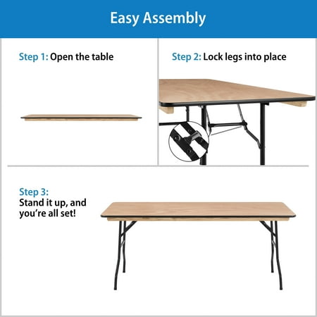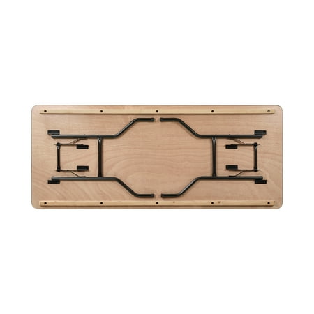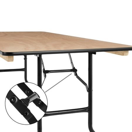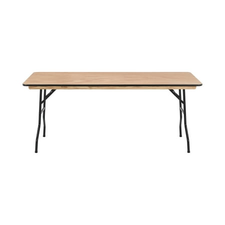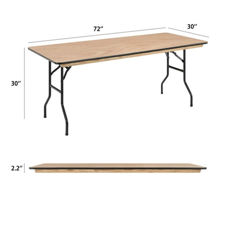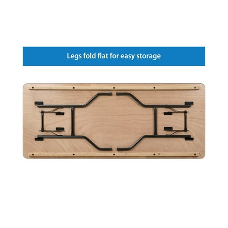 Always be ready for your next event or get-together with the Mainstays 6 foot Wooden Top Folding Table . Whether you're hosting a home, school, or business event, this wooden event table offers a reliable, on-demand, and stylish solution for when you need a little extra surface space for your guests. It comfortably seats up to 6 people, making it great for a variety of settings such as parties, conferences, family barbecues, trade shows, corporate events, reception areas, training rooms, banquet venues, and much more. The heavy-duty wishbone legs conveniently fold under the table for easy transportation and compact storage after use, and the non-marring floor caps on the bottom of the locking legs protect your flooring surfaces. Constructed with a 0.75" thick Okoume hardwood surface with an easy-to-clean Ultraviolet Curing Paint, this folding event table adds elegant style to all of your special events and withstands years of quality use. It can be used as is or dressed up with a tablecloth to achieve a custom look. This banquet table can support up to 580 pounds of static weight and measures 72"W x 30"D x 30"H with no assembly required, so you can start setting up for events right away. As needed, the low-maintenance rectangular folding table can be wiped down with a damp cloth for quick and easy cleaning.