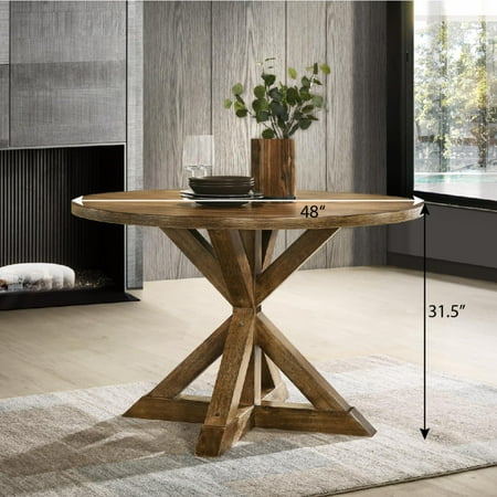 Introducing the Roundhill Furniture Windvale 47.25''Dia. Round Dining Table with Cross-buck Base! This table is an ideal addition to your dining area. It seats up to four people, features sleek lines, and boasts a minimalist design. The cross-buck pedestal base adds modern elegance, while the durable tabletop exudes chic charm. Constructed with an MDF Oak veneer tabletop and a solid Rubberwood base, this round table provides ample space for hosting family and friends. Whether it's a casual meal or entertaining guests, the Windvale dining table is bound to impress. Enhance your dining area today! Available in three table colors: Black, Oak, and Espresso.