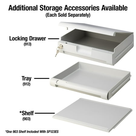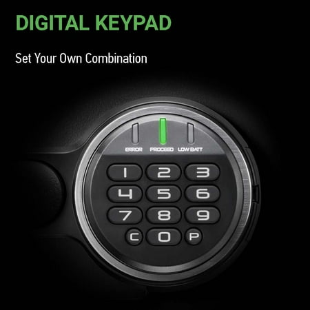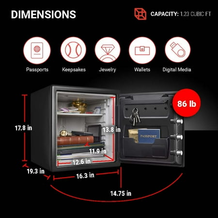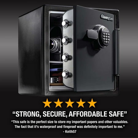 The SentrySafe Digital Water and Fireproof Safe SFW123ES offers reliable security for your valuables with solid steel construction, a pry-resistant hinge bar, and four large, one inch bolts. This one safe is designed with an interior key rack, door tray and door pocket to keep your items organized, this safe is ideal for your home and office security needs. Fire-resistant safe is UL Classified to endure 1 hour at 1700°F and keep interior temperatures safe for irreplaceable documents, valuables, DVDs, and USBs; ETL Verified to withstand a 15 foot fall during a fire and remain closed. Water-resistant safe is ETL Verified for 24 hours of protection in water up to 8 inches deep offering peace of mind in the event of a flood. Set your own digital combination fire safe for strong security; digital combination safe features four live-locking bolts, steel construction, pry-resistant hinge bar, and shelf. Exterior: 16.3 in. W x 19.3 in. D x 17.8 in. H; door requires 14.75 in. of space to fully open; Interior: 12.6 in. W x 11.9 in. D x 13.8 in. H; large 1.23 cubic foot capacity; weighs 85.25 pounds. For optimal performance, SentrySafe recommends the use of four high-quality, name branded, alkaline AAA batteries with an expiration date of 8-10 years from the current year. Generic and rechargeable batteries often do not have the lifespan needed to support long term usage