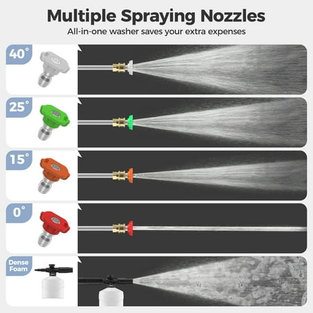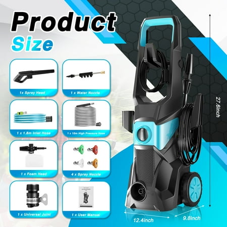 Why choose us? 【POWERFUL CLEANING】The Electric Pressure Washer has a deep cleaning water pressure of 3000 Max PSI and up to 2.4 GPM of water flow. While saving water and energy, it also ensures high cleaning efficiency and the ability to clean objects with complex shapes and structures, which makes it ideal for cleaning various surfaces in the home, such as driveways, patio furniture, and cars. 【MULTI-FUNCTIONAL USE】The Power Washer is equipped with four quick-connect metal spray nozzles (water-pressure strength:0°>15°> 25°> 40°) and a foam cannon. 4 metal nozzles with different pressure strengths for different application scenarios to meet your cleaning needs. The detergent bottle can be filled with chemicals such as bleach, the cleaner will not pass through the pump, so you don't have to worry about cleaning the machine. 【EASY TO USE】Equipped with a 32 FT hose, The Pressure Washers provides ample length to ensure freedom of movement. The design of two rollers breaks through the environmental limitations for easy movement and operation, while the bottom of the body adds an anti-tipping design for overall stability when not in motion. In addition, it can take water from both a faucet and a bucket, making it easy to create a clean space wherever you want. 【CONVENIENT STORAGE】The High Pressure Cleaning Machines are equipped with a power cord hook and nozzle holder for easy access. In addition, its compact design makes it easy to store in a garage or pantry when not in use. The high pressure washer is perfect for cleaning concrete, pavement, driveways, patios, decks, sidewalks, RVs, cars, boats, homes, fencing, and more. 【SAVING WATER & SAFETY】The Electric Pressure Washer using high-pressure water flow to clean up the dirt, is currently recognized as the world's most scientific, economical and environmentally friendly cleaning methods. While saving water and energy, it also ensures high cleaning efficiency. Specification: Item Type: Electric High Pressure Washer Material: ABS+Copper+Aluminum Pressure: 3000PSI Flow Rate: 2.4GPM Maximum Temperature: 40°C Waterproof Level: IPX5 Waterproof Outgoing Pipe Length: Approx. 32ft / 81.28cm Application: Suitable for car washing, fence cleaning, terrace maintenance Package List: 1 x Electric High Pressure Washer 7 accessories 1 x Spray Head 1 x Water Nozzle 1 x 1.8m Inlet Hose 1 x 10m High Pressure Hose 1 x Foam Head 4 x Spray Nozzle 1 x Universal Joint 1 x User Manual Note: Please read the user manual carefully before installation and use