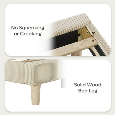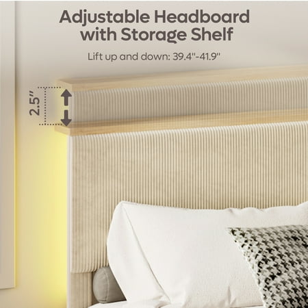 Bestier Queen Size Bed Frame Upholstered Corduroy Platform Bed with LED light & Adjustable Storage Headboard for Bedroom is the perfect upgrade for your bedroom.The upholstered headboard is wrapped in soft and skin-friendly corduroy to provide you with comfortable back support. Its vertical channel design adds a touch of elegant to your bedroom. The widened storage shelf on adjustable headboard, you can easily keep common small items such as phones, glasses, and books within easy reach. Enjoy a neat and organized sleeping space. Besiter Bed Frame collection will bring you an organized lifestyle and make everything seem to be easier. Bestier Love coming home.
