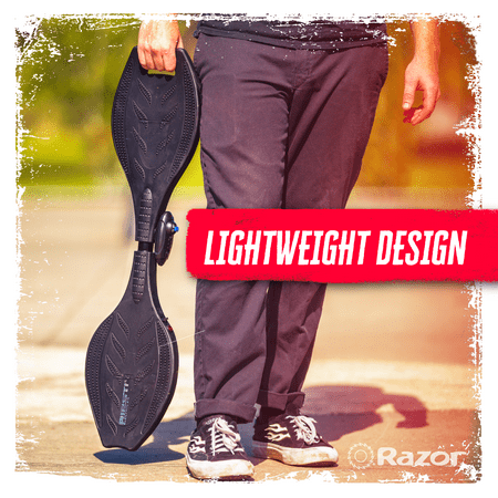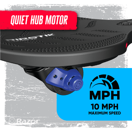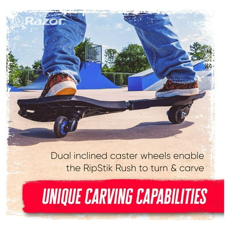 Razor takes a sharp turn from traditional electric skateboard designs with the all new board. Featuring a unique dual inclined caster wheel design, the Rush is capable of turning and drifting. A powerful miniature hub motor quietly accelerates riders up to 10 mph (16 km/h) while the Rush's RipStik technology allows the back end of the board to fishtail, carve, and drift like a snowboard or wakeboard. The Rush's handheld remote gives riders and conveniently stores on the side of the board when not in use. With a lightweight lithium-ion battery providing pull, the new RipStik Rush is the latest innovation in powered play from Razor.