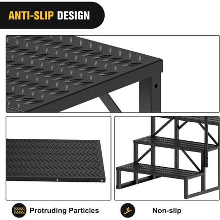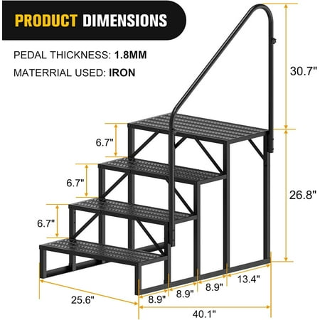 RV Steps with Handrail, 4 Steps Hot Tub Steps Outdoor RV Stairs Step Portable Mobile Motor Home Package Dimensions: 25.6"W x 57.5"H, 48 Pounds Material: Aluminum Color: Black Details DIMENSION Max load: 727LBS Total height of steps: 26.8" Handrail height from the ground: 57.5" Width of the first layer panel: 13.4" How to use RV step Assembling the pedestal rack Install the first panel and support rack Install other panel Install step and support racks handrail