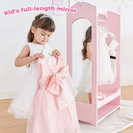 Make getting ready more magical for your little one with the Teamson Kids Little Princess Toy Clothing Rack with Storage and Hooks. This colorful and durable storage system features a pink design and contains ample space for your child's wardrobe. This kids clothing rack features a hanging area, four storage hooks along the top, and three storage hooks along the side for accessories and outwear, two lower shelves for shoes and toys, and a mirror on the outside for a convenient and complete clothing storage solution. Constructed of eco-friendly MDF, this sturdy doll chair is designed for long-lasting use, and its easy-to-clean surfaces make wiping up every day messes a breeze. Purchase the clothes rack on its own or with other items from the Little Princess collection for a bright and joyful playroom. For quick and easy assembly, this kids clothing rack includes step-by-step instructions. The clothing organizer measures 23.62" L x 11.38" W x 41.73" H to provide a versatile storage solution to your little ones without taking up too much space in their bedroom or play area. The Teamson Kids Little Princess Toy Clothing Rack with Storage and Hooks is recommended for children ages 3 years and up.