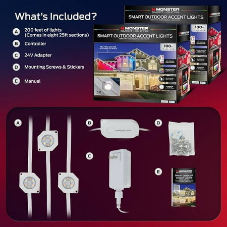 Transform your outdoor space with the Monster Smart Outdoor Accent Lights, featuring 200ft of RGB lights and multiwhite technology. This lighting solution provides dazzling displays with the ability to show multiple colors at once, adding a vibrant touch to any setting. Perfect for holidays like Christmas and Halloween or for year-round use, these outdoor lights offer versatility and style for your home or garden. With 144 LEDs providing extensive coverage, these outdoor LED lights can illuminate large areas, making them ideal for decorating your home, garden, or patio. The 200ft length ensures you have ample coverage for your space, whether indoors or outdoors. The smart lights are designed to be durable, with an IP67 rating for reliable performance in all weather conditions, ensuring they will shine bright no matter the season. Control the smart light easily through the Monster Smart app or with voice commands via Google Assistant, Alexa, or Siri. The lights also feature sound-reactive capabilities, syncing with your music or media for dynamic lighting effects. With custom schedules and timers, you can automate your lighting to fit your lifestyle, adding convenience and ambiance to your outdoor living spaces. Illuminate your outdoor space in style with Monster Smart Permanent Outdoor Lights!