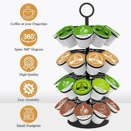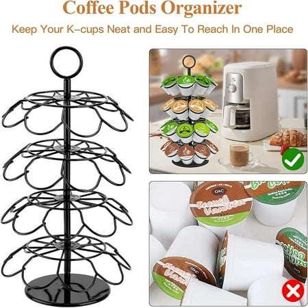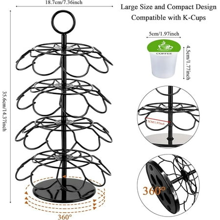 【Large Capacity Hold 36 Pods】 coffee pod holder is compatible with coffee pods, holds 36 coffee pods. a nice holder to display and store your coffee pods to keep your kitchen neat, clean. This coffee accessory is suitable for your kitchen, office, coffee bar. 【360-Degrees Revolving Base】The lazy Susan base platform revolves and spins 360-degrees, which makes coffee pods holder simple and convenient to find and choose your favor coffee. 【Nice Coffee Pod Organizer for Kitchen Countertop】cup holder is 14.3 inches in height, 7.36 inches in diameter, Saving space for counter with a compact circular design, rather than a large coffee pod storage drawer. And it is perfect next to your coffee maker. 【High Quality Coffee Bar Accessories】 coffee station organizer is made of high quality metal material, which not only has a smooth gloss surface, but also a strong structure, makes it last, hard to break, and easy to clean. 【Detachable Coffee Pod Holders, Simple to Assemble】The detachable design makes this coffee pod holder more convenient to use, it can be installed in a few steps refer to our installation video. It is a nice gift for our friends, family and coworker who like to drink coffee.
