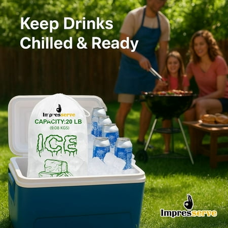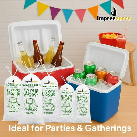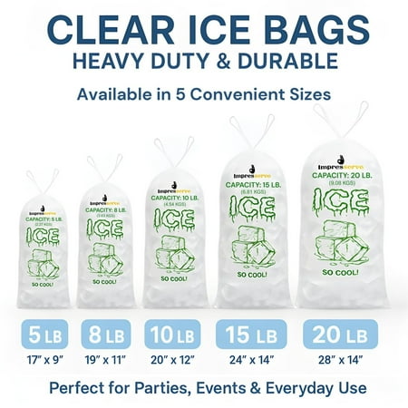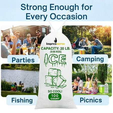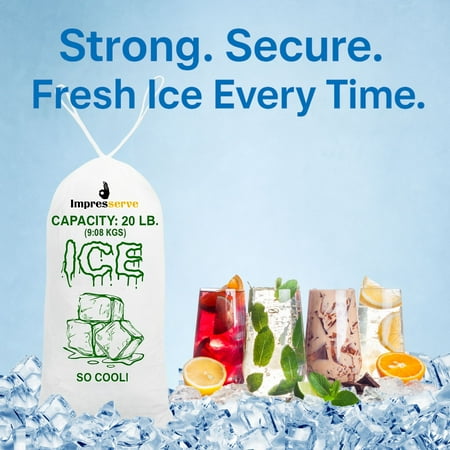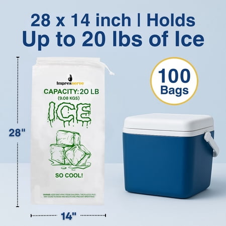 Impresserve Plastic Ice Bags with Drawstring Closure | 20 Lb. | 28 x 14 Inch | 100 Count Make transporting and storing ice cubes effortless with Impresserve Plastic Ice Bags. Crafted with premium plastic, these disposable bags are strong, durable, and resistant to bursting open. Featuring a convenient drawstring closure, these bags are easy to secure and transport. Their thickness ensures they won't break or tear easily, providing peace of mind during usage. Ideal for various occasions such as garden parties, beach parties, house parties, camping, fishing, picnics, and more. These bags offer excellent quality at a great price, making them a valuable choice for all your ice storage needs.