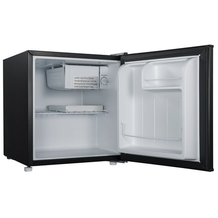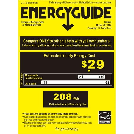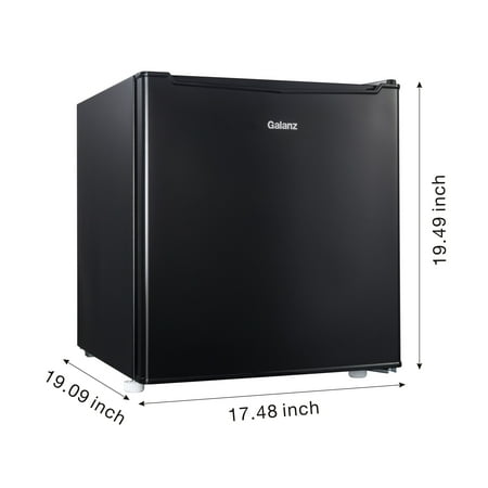 Keep your food and drinks chilled with the Galanz GL17BK 1.7 Cu Ft Single Door Mini Fridge. It stands less than 2' tall, giving you access to a compact size cooler that's ideal for use in a dorm room, an office, a game room or a man cave. The black mini fridge features a half-width freezer compartment that is suitable for storing ice and frozen food. It also has a coated wire shelf that slides out for easy access to items stored in the back. It even features a lower storage area and the interior door has space for condiments and a 2-liter bottle. Additionally, the Galanz GL17BK 1.7 Cu Ft Single Door Mini Fridge includes two leveling front legs for improved stability and a reversible door that enables you to hang it opening from either the left or the right side. Condition: New; Stock Number: GL17BK