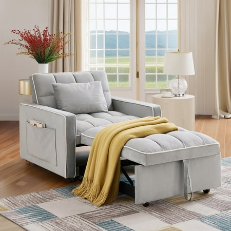 Dinosisco 3-in-1 Convertible Chair Bed, Sleeper Chair Lounge Chair Indoor, Modern Single Pull Out Couch for Living Room, Gray Velvet