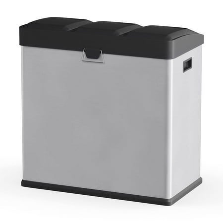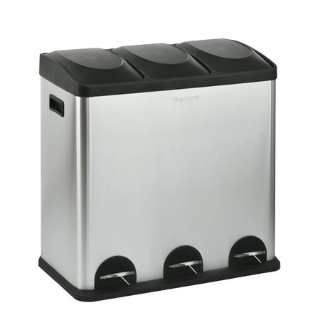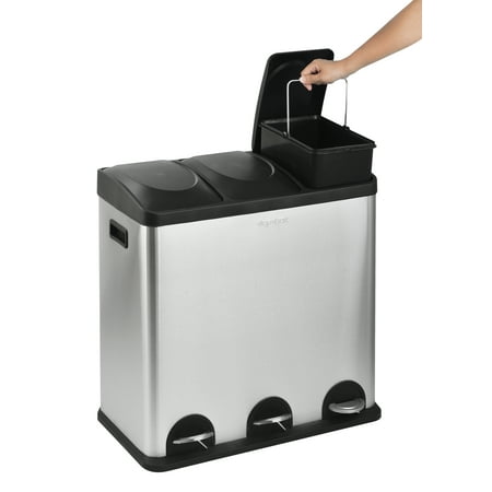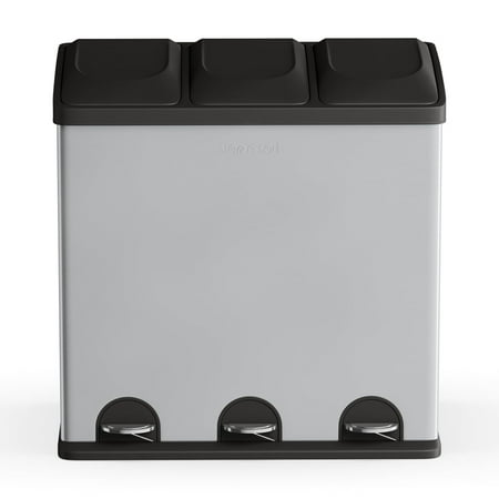 Cut down on the litter with this Step N' Sort 16-Gal 3-Compartment Stainless Steel Trash and Recycling Bin. It provides a convenient solution for waste, recycling and storage needs. It features three removable containers with attached metal handles. Constructed with a heavy duty frame, this stainless steel bin features individual hands-free step pedals that raise and lower the lids for easy placement and removal of the stored contents. You can also use the recycling bin to sort recyclables, garbage, laundry detergent or dog food. Place either an 8- or 10-gallon trash bag in each of the compartments or use them on their own. This unit has a sleek exterior and a rectangular shape that fits beautifully into many kitchen decors.
