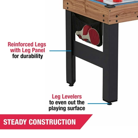 The MD Sports 5 in 1 48" Combo Game Table includes billiards, slide hockey, soccer, table tennis, basketball all in one compact design. The unique design features reinforced legs for additional durability. Set up whatever game you want in minutes! Just stack up and change the game easily. Have endless amounts of fun with any game of your choice on a whim. The MD Sports 5 in 1 Combo Table comes with all the accessories needed to play all five games. It also comes with built-in storage space to organize accessories after playing. This combo game table features reinforced legs with leg panels and leg levels to withstand rough play and level out the playing surface. It also features a slide safety lock for table stability during play. With the MD Sports 5 in 1 48" Combo Game Table, never worry about having too much fun with family and friends!