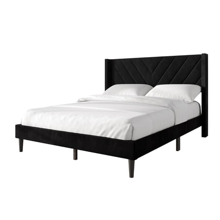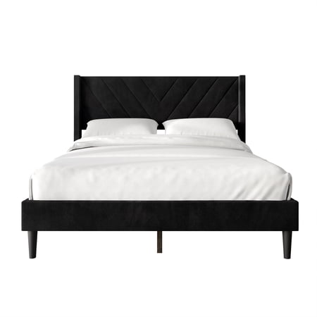 Transform your bedroom with this modern upholstered bed featuring a stylish V-shaped wingback headboard for added comfort and visual appeal. The frame is wrapped in soft, 100% polyester velvet that’s smooth, durable, and easy to clean. No box spring is needed—just add your mattress for a sleek, low-profile look. Enjoy extra storage space and easy cleaning thanks to the under-bed clearance, perfect for robot vacuums or bins. Built with a strong solid wood frame and reinforced plastic legs, this bed ensures long-lasting stability. Available in multiple colors including Beige, Black, Silver Grey, Light Grey, Brown, Light Blue, and Navy Blue, and in Twin, Full, Queen, and King sizes. Simple step-by-step instructions make assembly quick, and it ships in one compact box for your convenience.