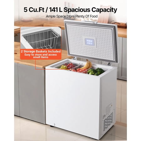 Product Description VEVOR Chest Freezer With a 5 cu.ft capacity and two removable baskets, the VEVOR chest freezer provides organized storage to keep ingredients cold and fresh for longer. Space-saving and energy-efficient, it is an ideal addition to home kitchens, small eateries, and garages without taking up much space. Adjustable Temperature Supporting -15°F to 7°F adjustment for freezing and 32°F to 50°F adjustment for refrigeration, this compact deep freezer accommodates a wide range of food storage needs. Easy Operation Intelligent digital display allows you to monitor operating status in real time and adjust the temperature precisely. Energy Efficient Featuring a high-efficiency R600a compressor and a direct cooling system, our chest deep freezer ensures efficient cooling with 0.59 kWh/day low power consumption and 42dB quiet operation. Wide Applications Sleek and compact, this top open chest freezer seamlessly integrates into home kitchens, small restaurants, and garages, helping preserve the freshness and nutrients of your food. 2 Removable Baskets Convenient for flexible food storage and easy access, making organization and retrieval more convenient. Rubber Leveling Feet Stays stable on various surfaces while reducing vibration and noise during operation. Specifications Item Model Number: BD142JEW Rated Power: 75W Capacity: 5 Cu.ft / 141 L Adjustable Temperature Range: -15℉ to 7℉ / -26℃ to 14℃ ; 32℉ to 50℉ / 0℃ to 10℃ Cooling Method: Direct Cooling Noise Level: 42 dB Main Materials: Shell: PCM ; Interior: Aluminum Plate ; Door Frame: ABS Product Weight: 57.8 lbs / 26.2 kg Product Dimensions: 29.72 x 22.64 x 33.46 inch / 755 x 575 x 850 mm Package Content 1 x User Manual 1 x Ice Shovel 2 x Storage Baskets 1 x Drain Plug 1 x Chest Freezer