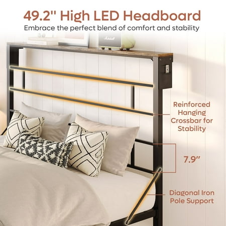 Bestier Queen Size Bed Frame with 49.2" High LED Storage Headboard Shelf, Metal Platform Bed, Black is the perfect addition to any bedroom, it is designed to meet your various needs. 49.2" High Headboard Provide plenty of back and neck support to make you more comfortable while reading or playing games. Multi-functional storage space can meet a variety of storage needs. The design of two side crossbars can prevents the mattress from sliding. In addition, Adjustable smart LED and DIY Storage Space can easily create a relaxing and warm atmosphere for your sleep environment. Besiter Bed Frame collection will bring you an organized lifestyle and make everything seem to be easier. Bestier Love coming home.